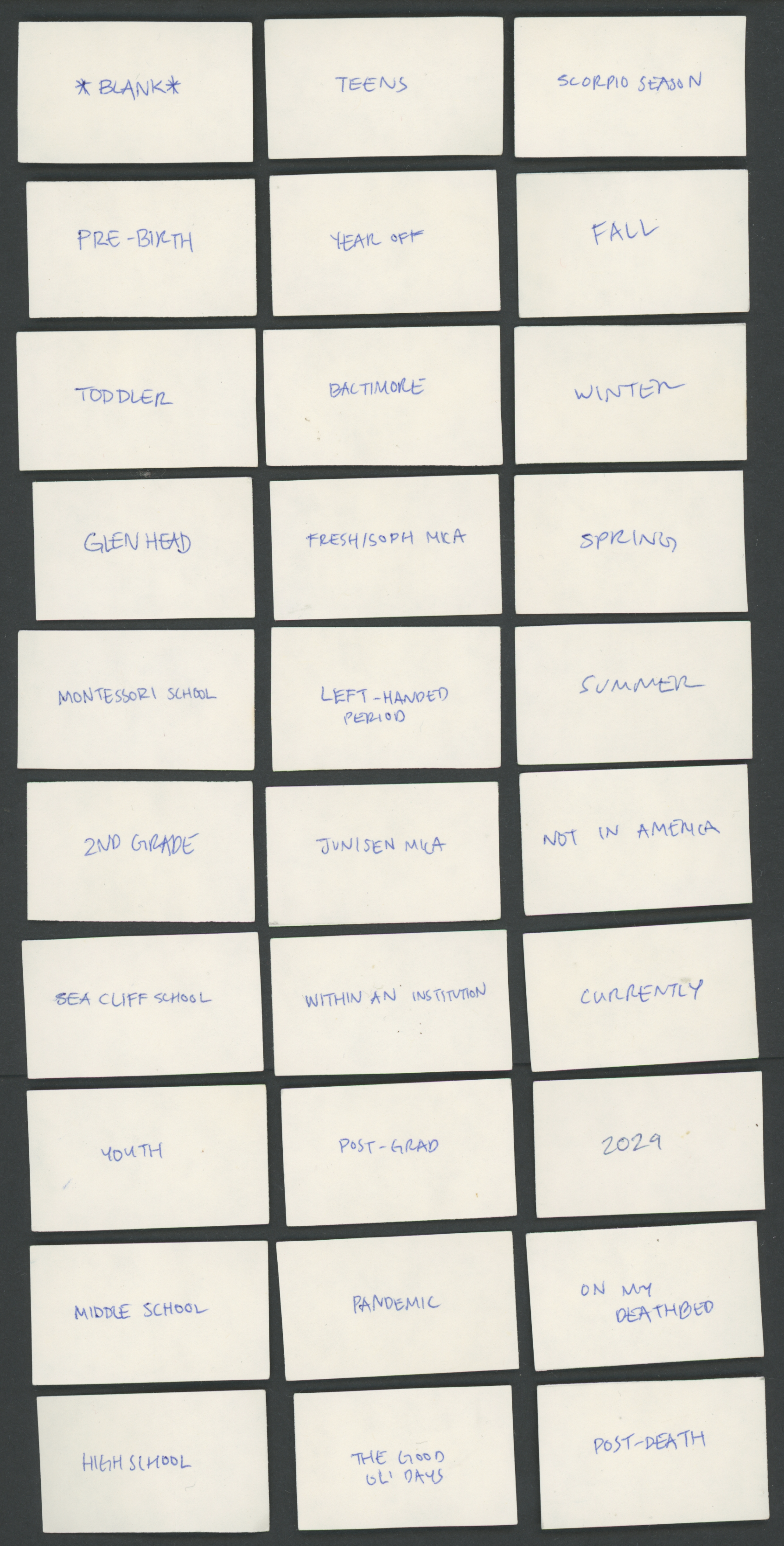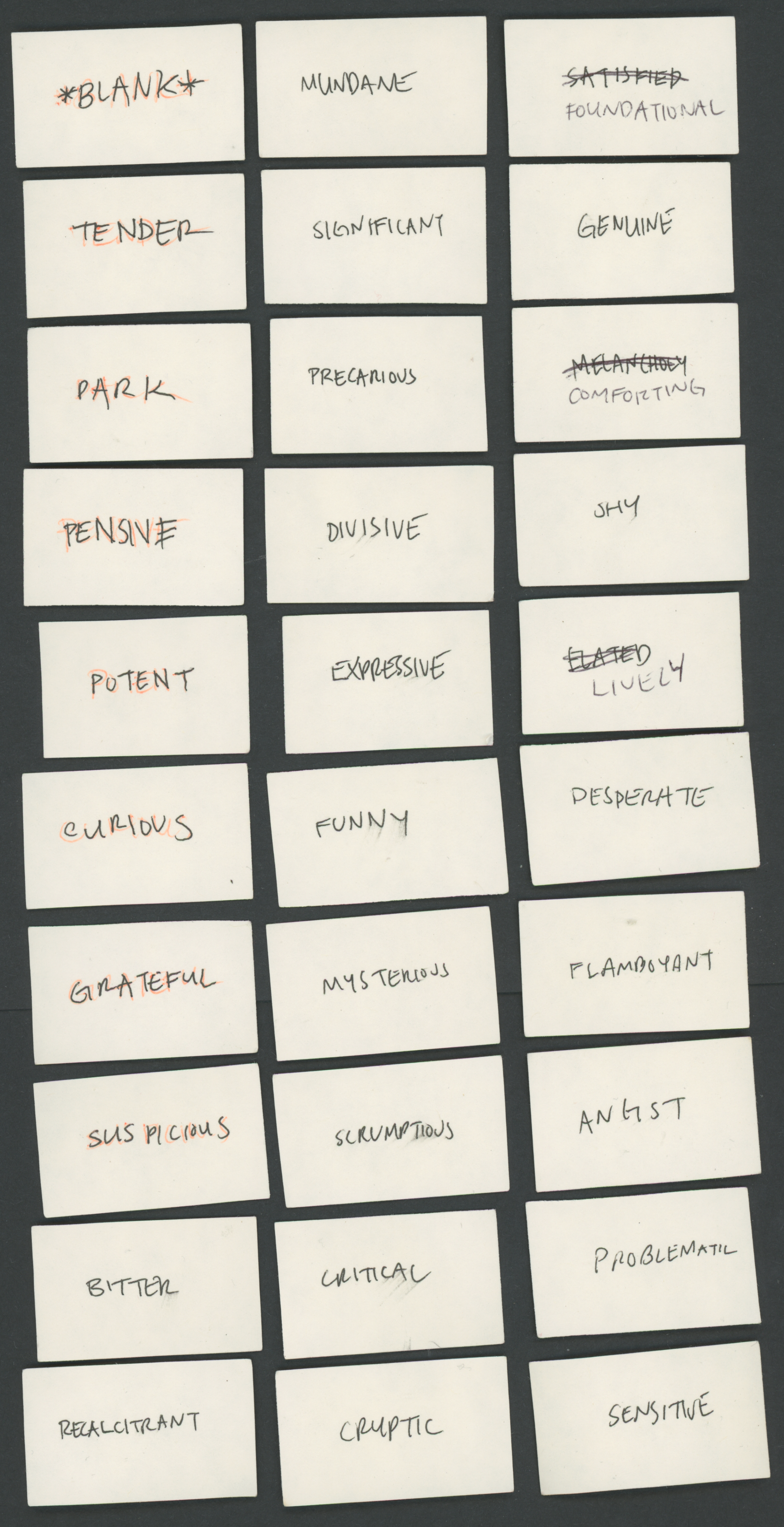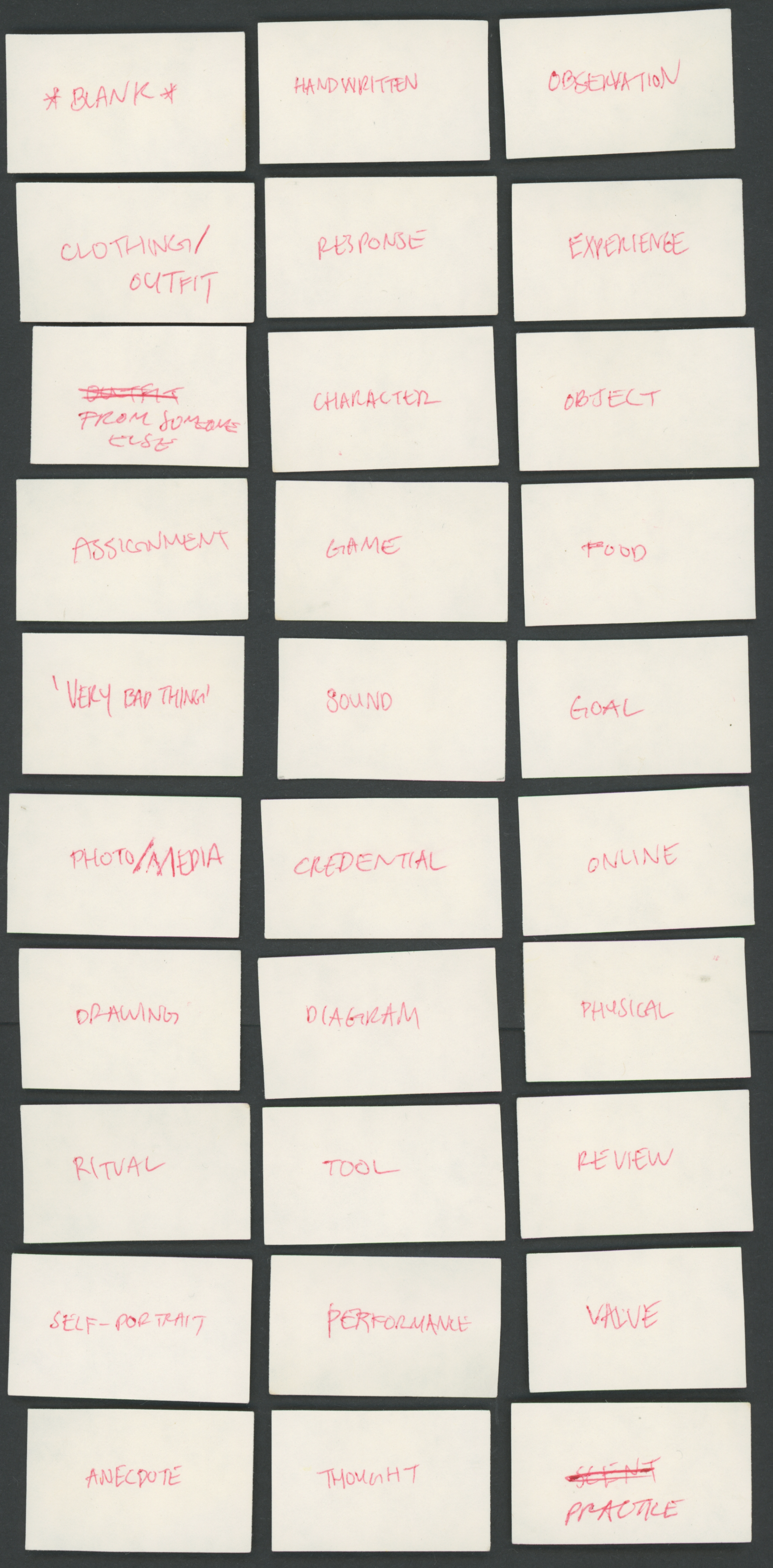using a physical card drawing system—based off of sal randolph’s game of art—i drew three cards as a starting point.