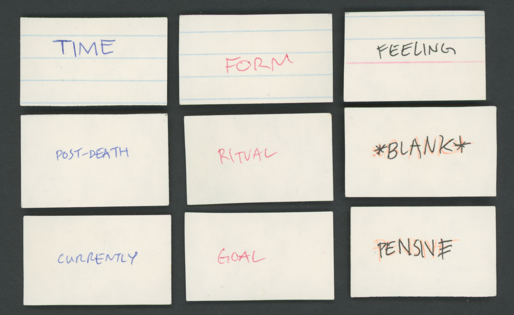 for example: the combination of cards that determined content one- funeral wishes[4], are postdeath, ritual, *blank*.